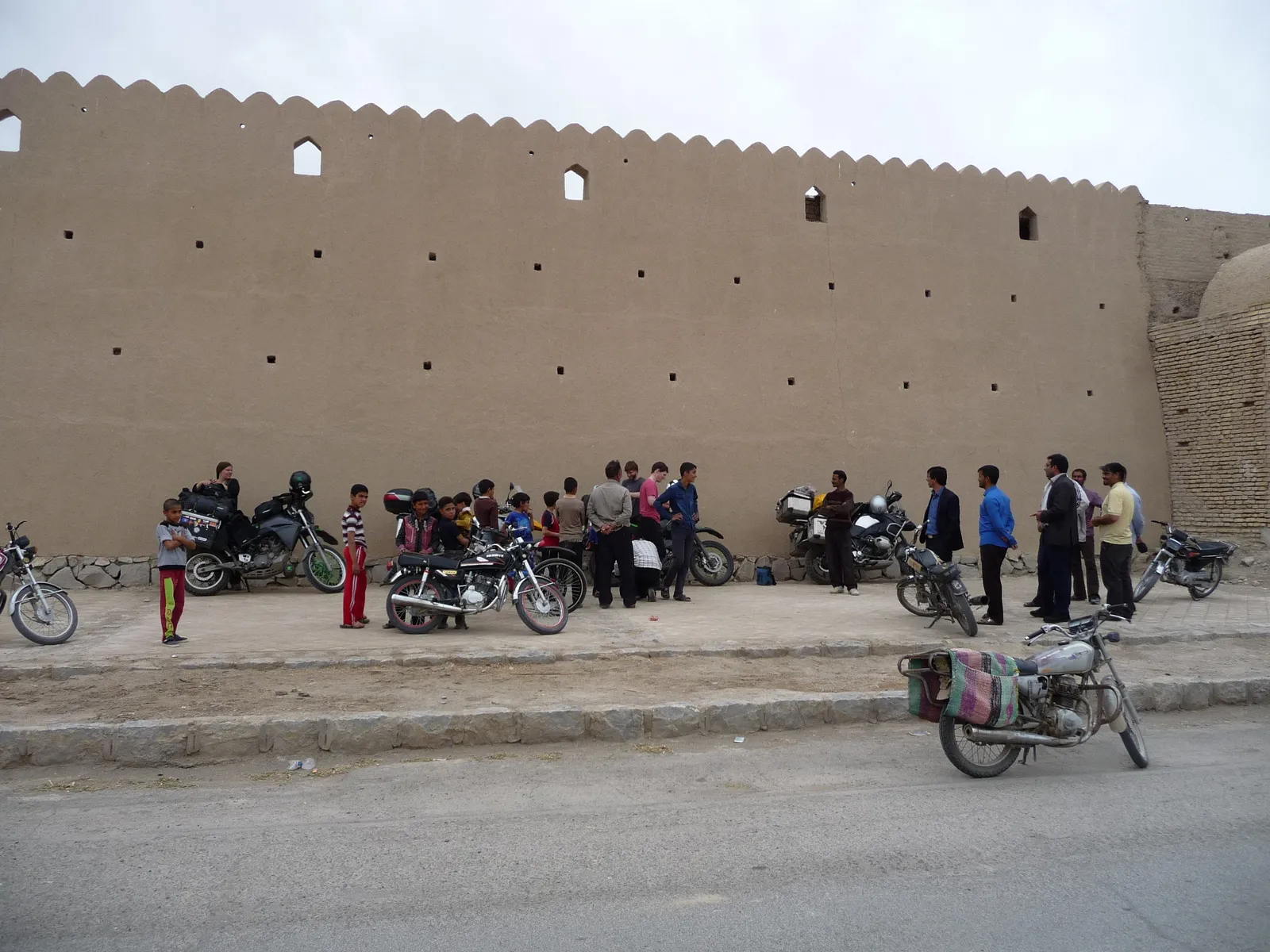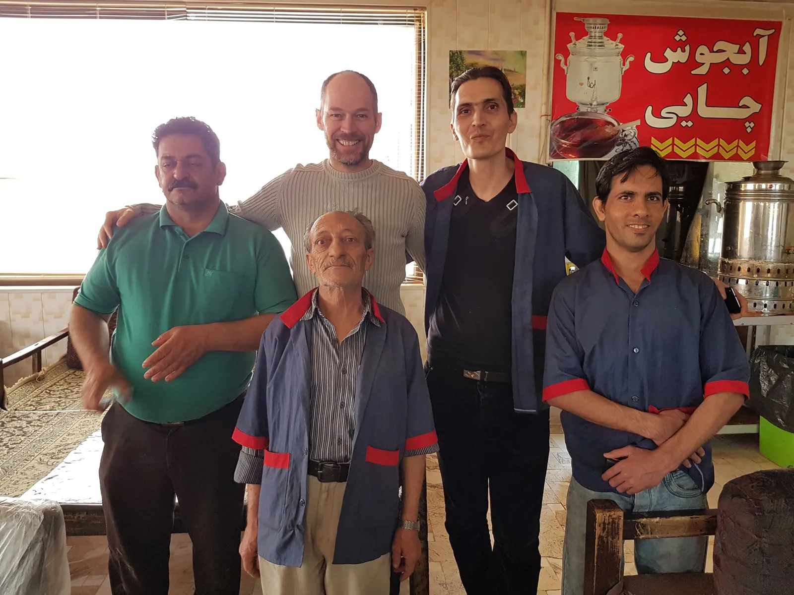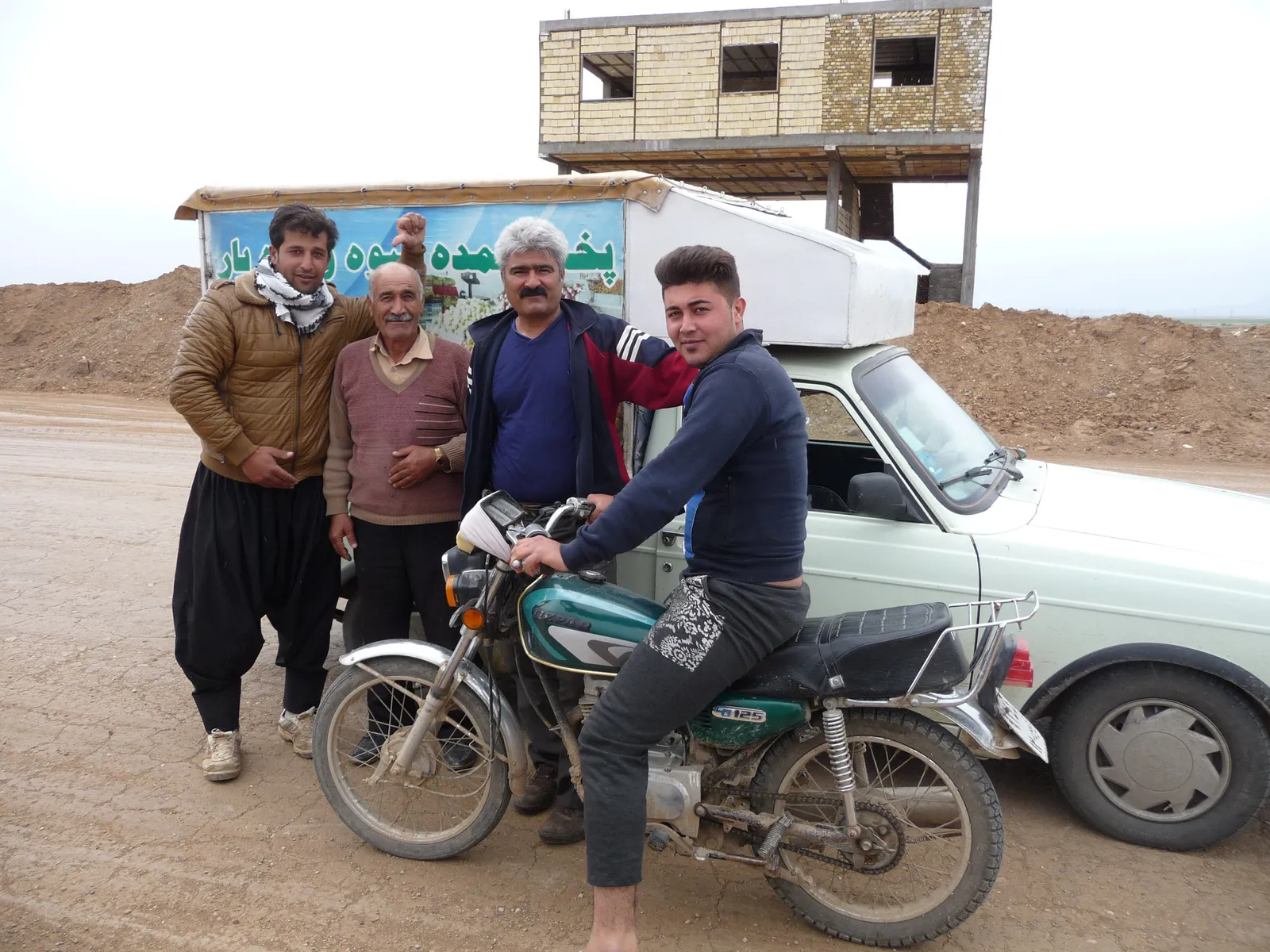 Im Iran treffen wir auf unglaublich liebevolle, offene und hilfsbereite Menschen. Kaum machen wir irgendwo Halt, kommen die Iraner auf uns zu, erkundigen sich nach unserer Herkunft und unseren Plänen, wollen mit uns und unseren Motorrädern Fotos schiessen und laden uns zum Tee, zum Essen oder gleich zum Übernachten ein. So sind wir zum Beispiel zu Gast bei der Familie eines Kriegsveteranen aus dem Golfkrieg; ein Tankstellenwart erbarmt sich unser nach nasser kalter Fahrt und organisiert Gasheizung, Decken und Tee; der Chefmechaniker lädt uns nach getaner Reparatur an der Felge zum Übernachten zu seiner Familie ein; und viele Frauen wirken fliessig im Hintergrund, wenn uns ihre Männer Gastfreundschaft anbieten. In konservativen Familien dürfen wir den Frauen nicht die Hand reichen, sie nicht ansprechen, sie dürfen nicht mit aufs Familienfoto und sie essen auch nicht mit uns - Gleichberechtigung ist kein Thema. Einen Ruhetag verbringen wir im Sommerhaus von Saeed. Er zeigt uns die Umgebung, organisiert eine Spezialführung durch eine heilige muslimische Stätte und stellt uns seine einflussreichen Cousins und Freunde vor. Zum Frühstück geniessen wir Schafskopf, eine iranische Spezialität, und noch etwas mehr geniessen wir am Nachmittag die im Garten grillierten Kebab-Spiesse.