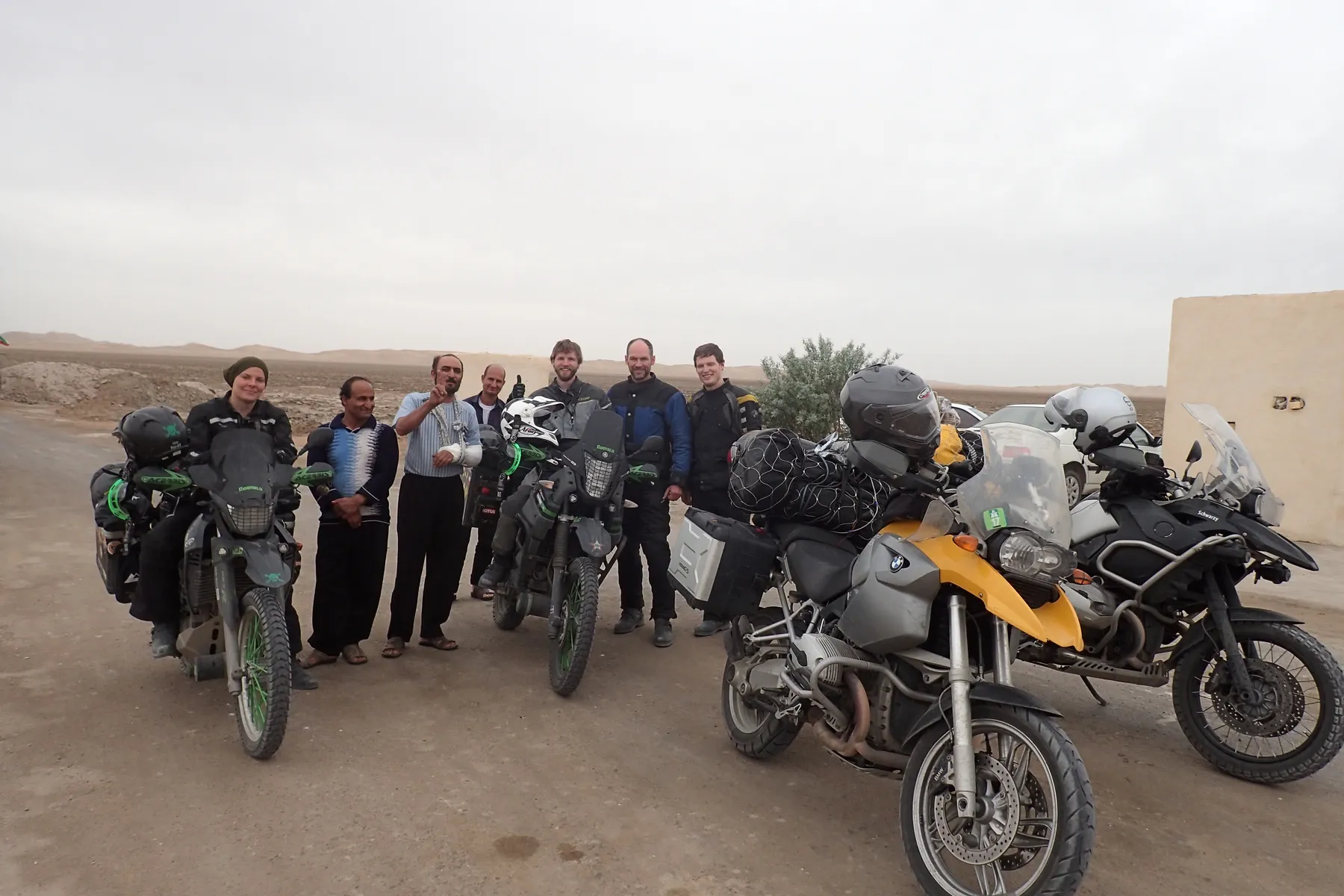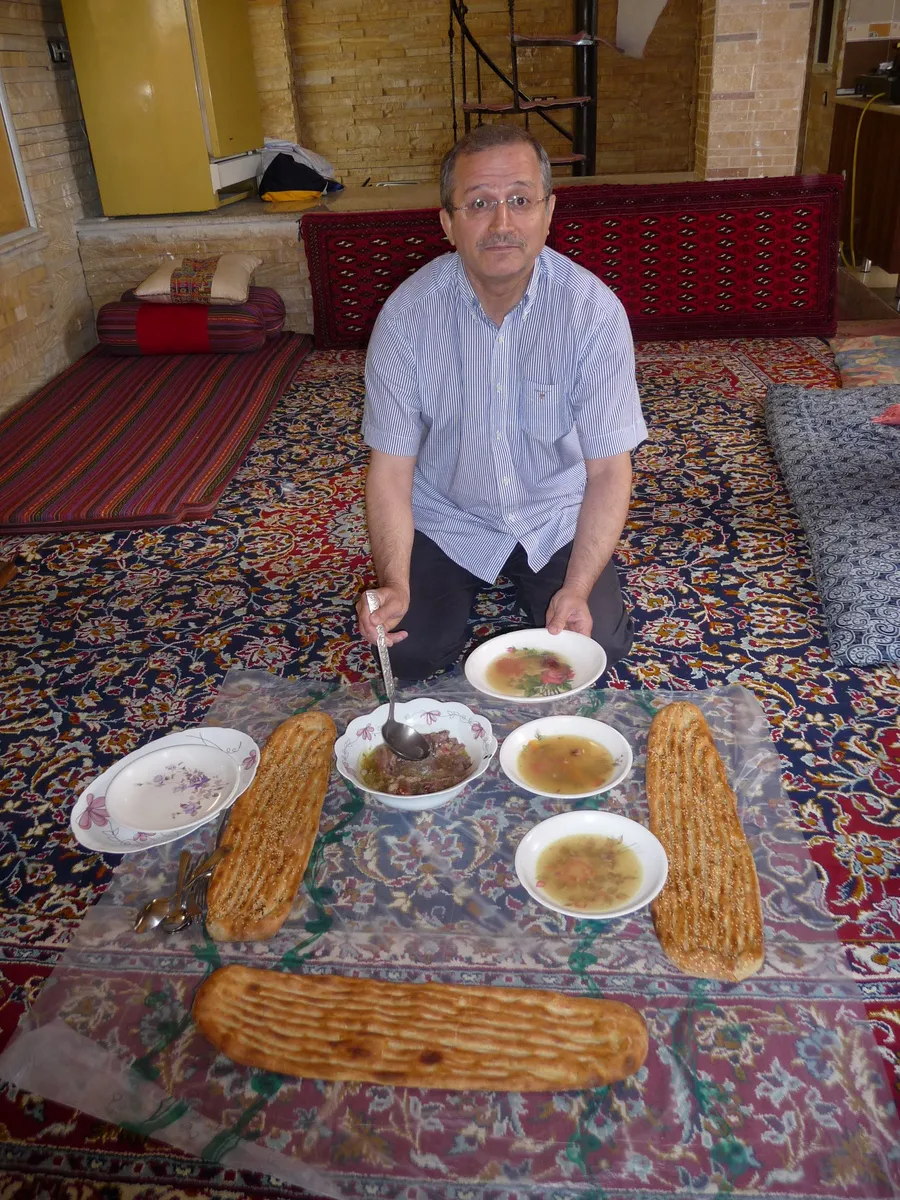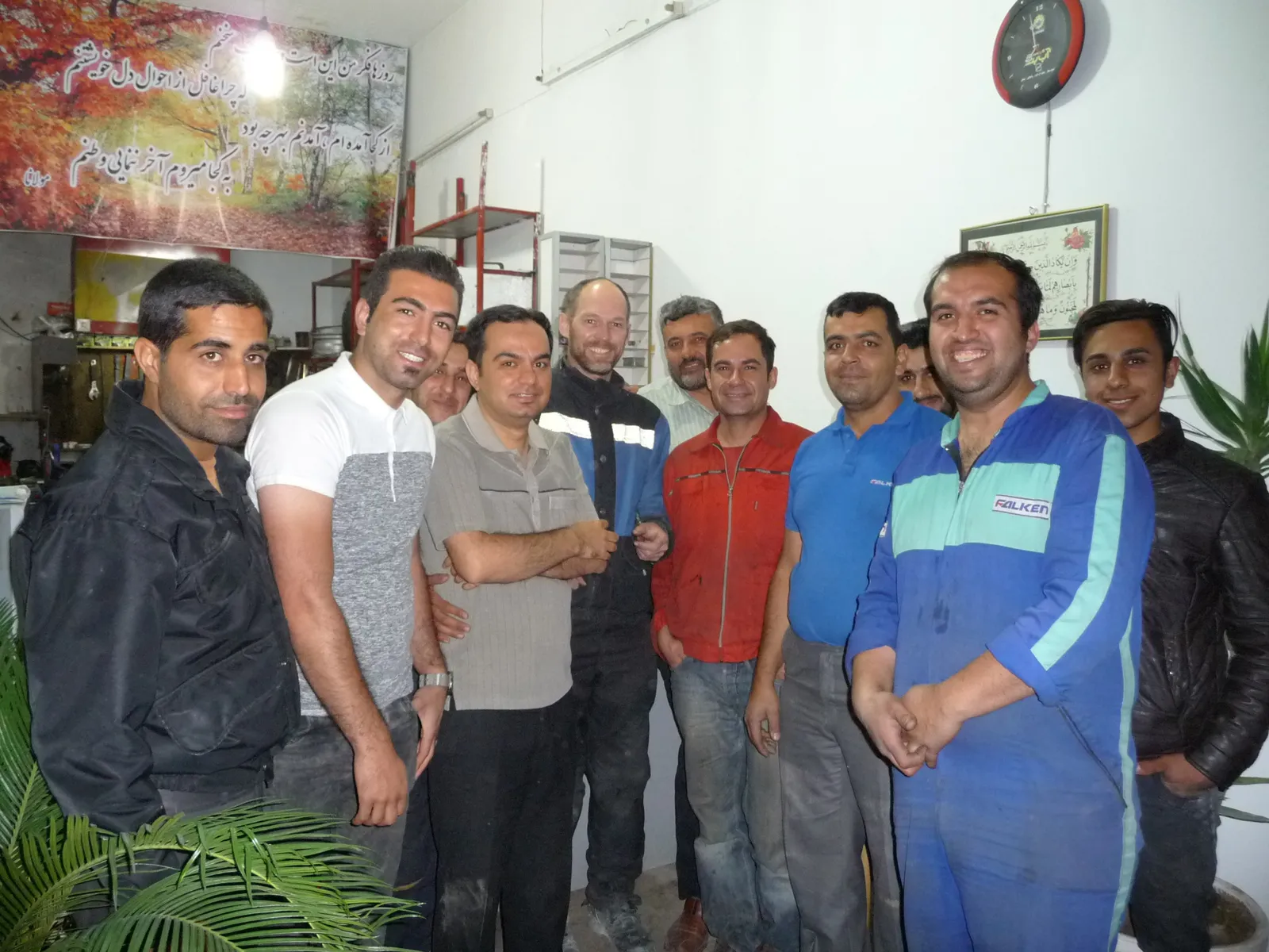 Im Iran treffen wir auf unglaublich liebevolle, offene und hilfsbereite Menschen. Kaum machen wir irgendwo Halt, kommen die Iraner auf uns zu, erkundigen sich nach unserer Herkunft und unseren Plänen, wollen mit uns und unseren Motorrädern Fotos schiessen und laden uns zum Tee, zum Essen oder gleich zum Übernachten ein. So sind wir zum Beispiel zu Gast bei der Familie eines Kriegsveteranen aus dem Golfkrieg; ein Tankstellenwart erbarmt sich unser nach nasser kalter Fahrt und organisiert Gasheizung, Decken und Tee; der Chefmechaniker lädt uns nach getaner Reparatur an der Felge zum Übernachten zu seiner Familie ein; und viele Frauen wirken fliessig im Hintergrund, wenn uns ihre Männer Gastfreundschaft anbieten. In konservativen Familien dürfen wir den Frauen nicht die Hand reichen, sie nicht ansprechen, sie dürfen nicht mit aufs Familienfoto und sie essen auch nicht mit uns - Gleichberechtigung ist kein Thema. Einen Ruhetag verbringen wir im Sommerhaus von Saeed. Er zeigt uns die Umgebung, organisiert eine Spezialführung durch eine heilige muslimische Stätte und stellt uns seine einflussreichen Cousins und Freunde vor. Zum Frühstück geniessen wir Schafskopf, eine iranische Spezialität, und noch etwas mehr geniessen wir am Nachmittag die im Garten grillierten Kebab-Spiesse.