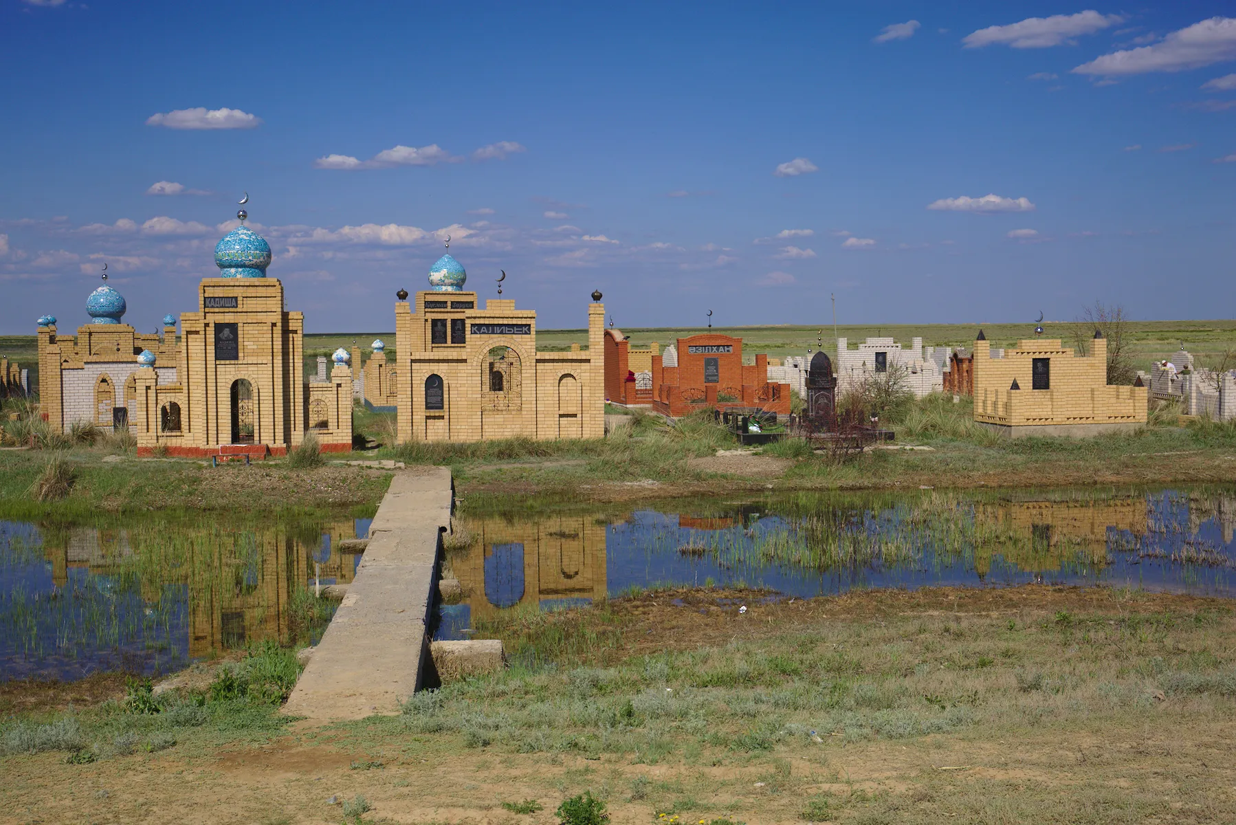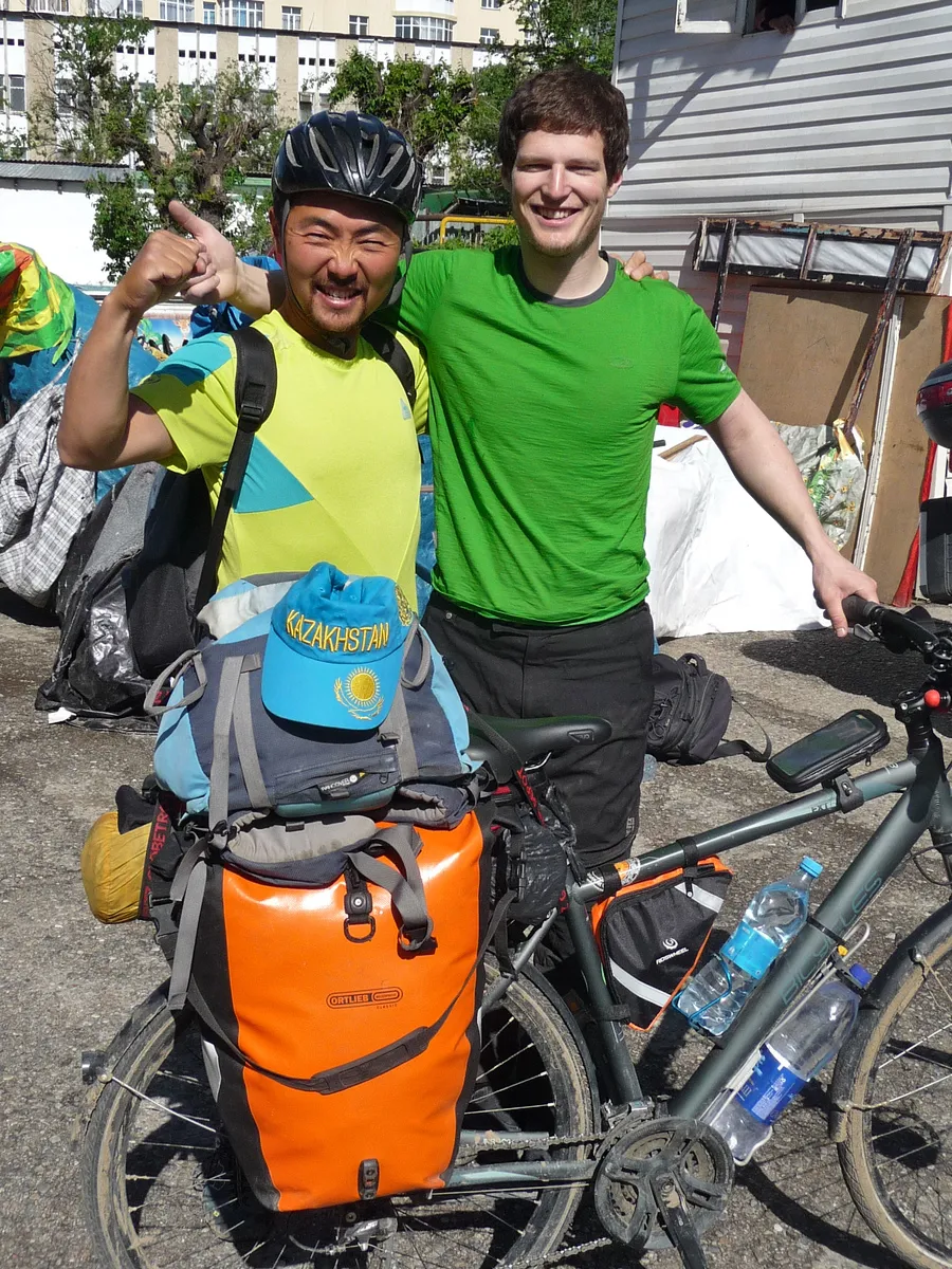 In Taras treffen wir - was für ein Zufall - Sam wieder, den Südkoreaner, der mit dem Velo unterwegs ist. Vor einer Woche hatten wir uns nach der Überfahrt über das kaspische Meer von ihm verabschiedet (nein, sein Fahrrad fährt nicht schneller als unsere BMW’s, er hat Usbekistan mit dem Zug umfahren). Es gibt viel zu erzählen und wir stossen mit sehr guten kasachischem Bier auf das unglaubliche Wiedersehen an.