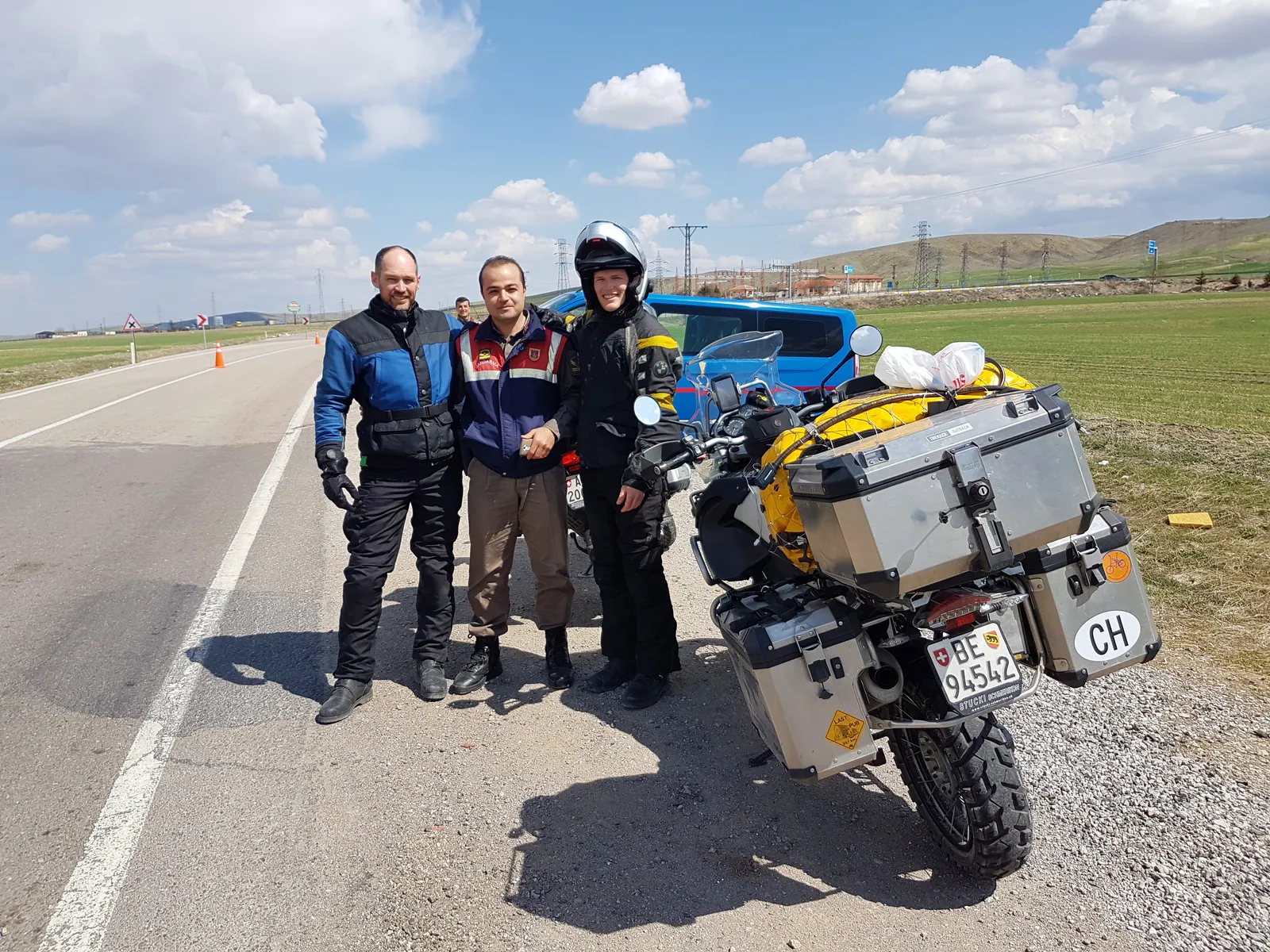 Die nächsten beiden Tage führt uns die Route durch Anatoliens wunderschöne Hügellandschaften, nur ab und zu ein Halt, um Benzin und Çai zu tanken. Auf Murats Bauernhof schlagen wir unser Zelt auf und sind froh, dass wir uns nach dem Ruf des Muezzins um 5 Uhr nochmals im Schlafsack umdrehen können. Nachdem die ersten Regentropfen unserer Reise kurz an die Zeltwand geklopft haben, stehen wir wieder im Trockenen auf und satteln unsere Motorräder. Zum ersten Mal werden wir von einer Polizeistreife angehalten. Zu schnell? Sicherheitslinie übersehen? Bikes nicht in Ordnung? Entwarnung: Der Chef der Truppe, selber Motorradfahrer, will ein Foto mit uns. Nach dem Shooting nochmals 200 Kilometer bis zu unserem Tagesziel Göreme. Janosch ist übrigens nicht zum Islam konvertiert und betet nicht gegen Mekka - er versucht lediglich, ein akutes Ziehen mit Rückengymnastik zu lindern.