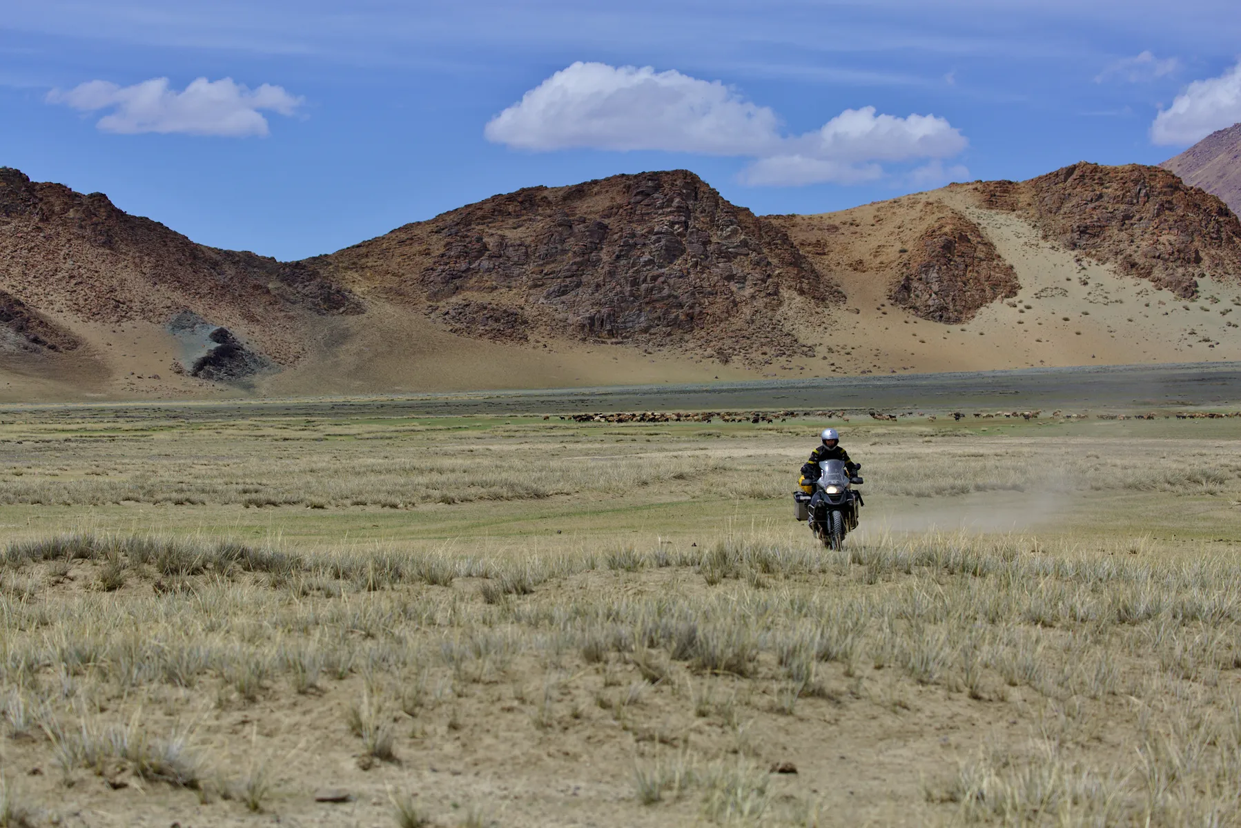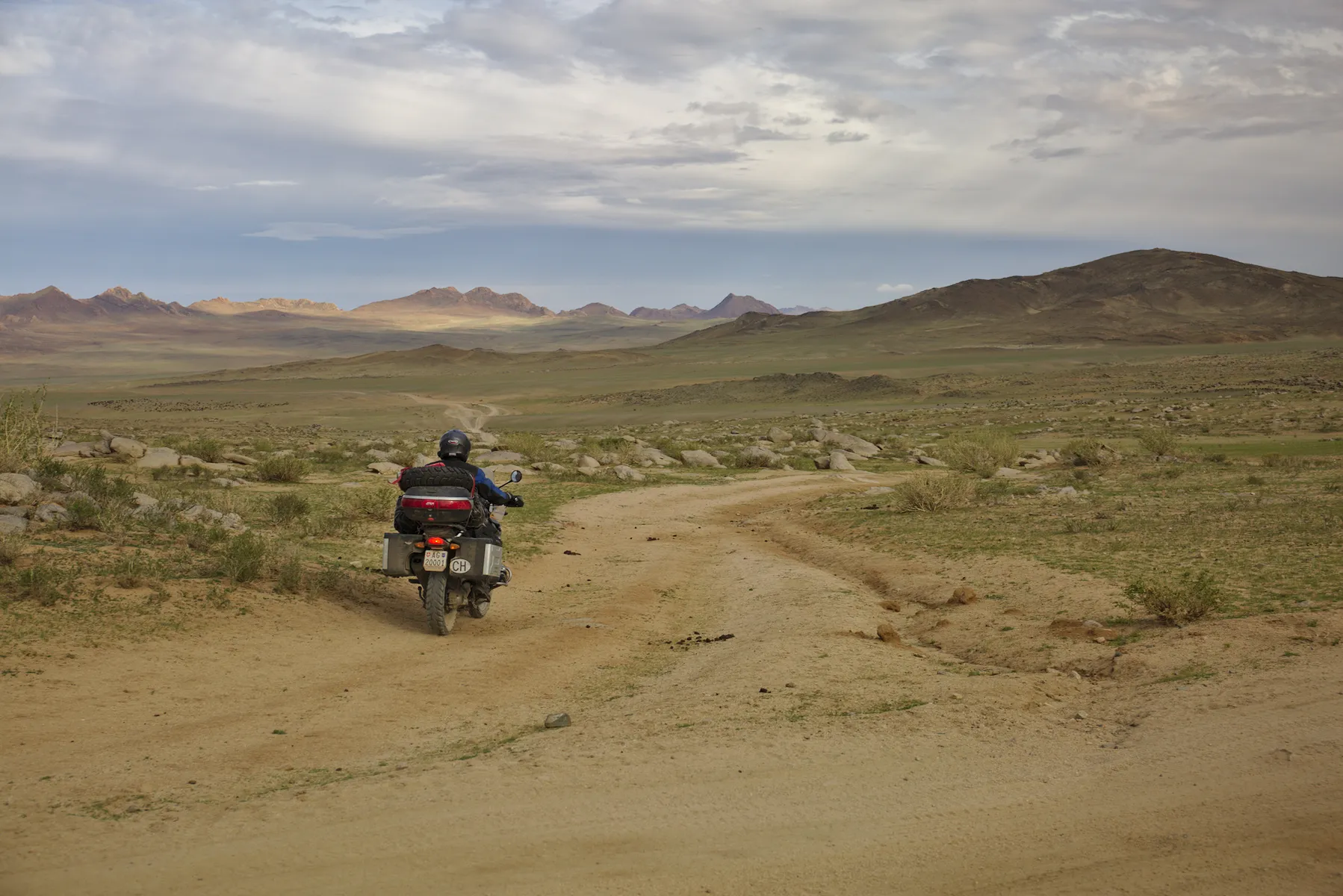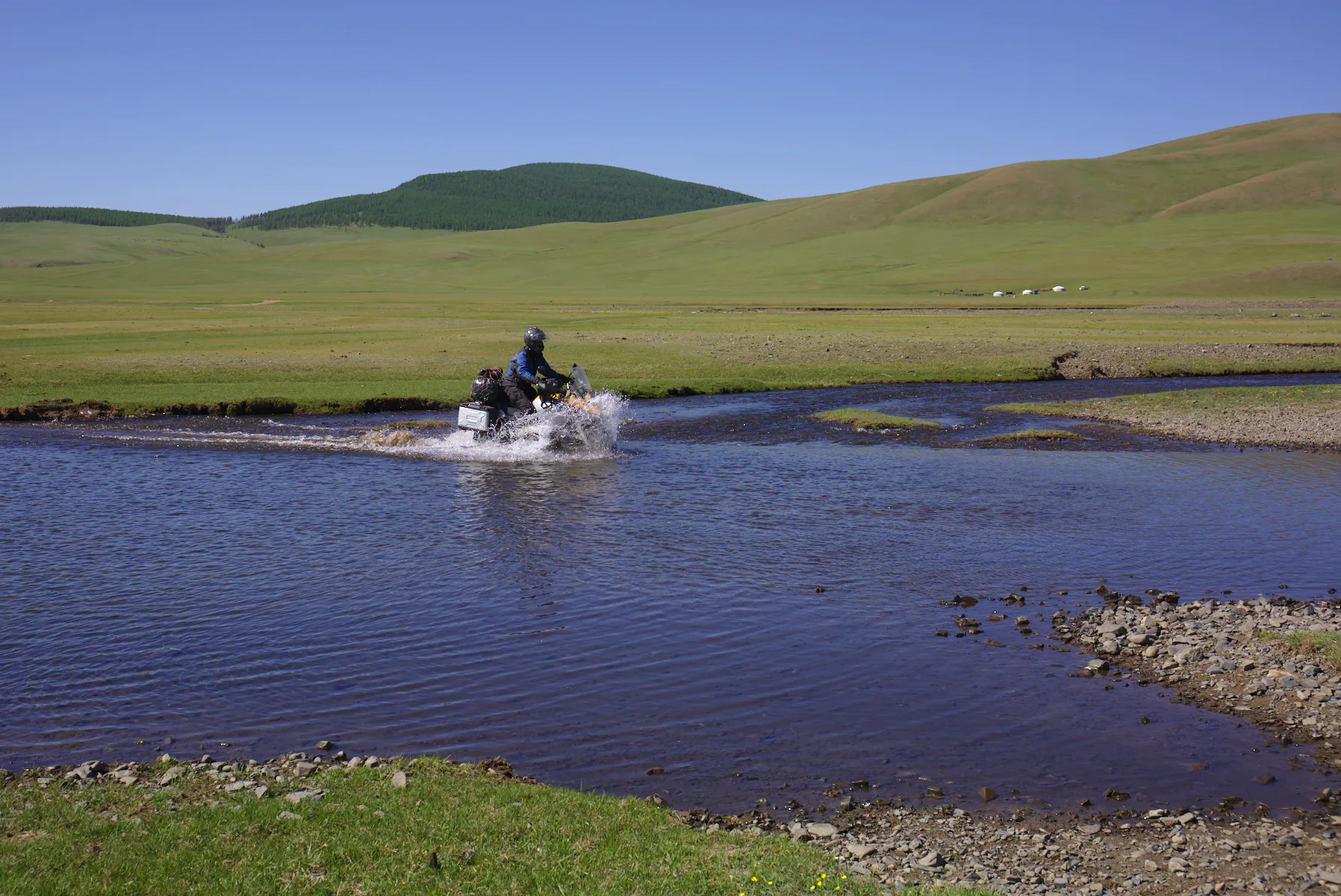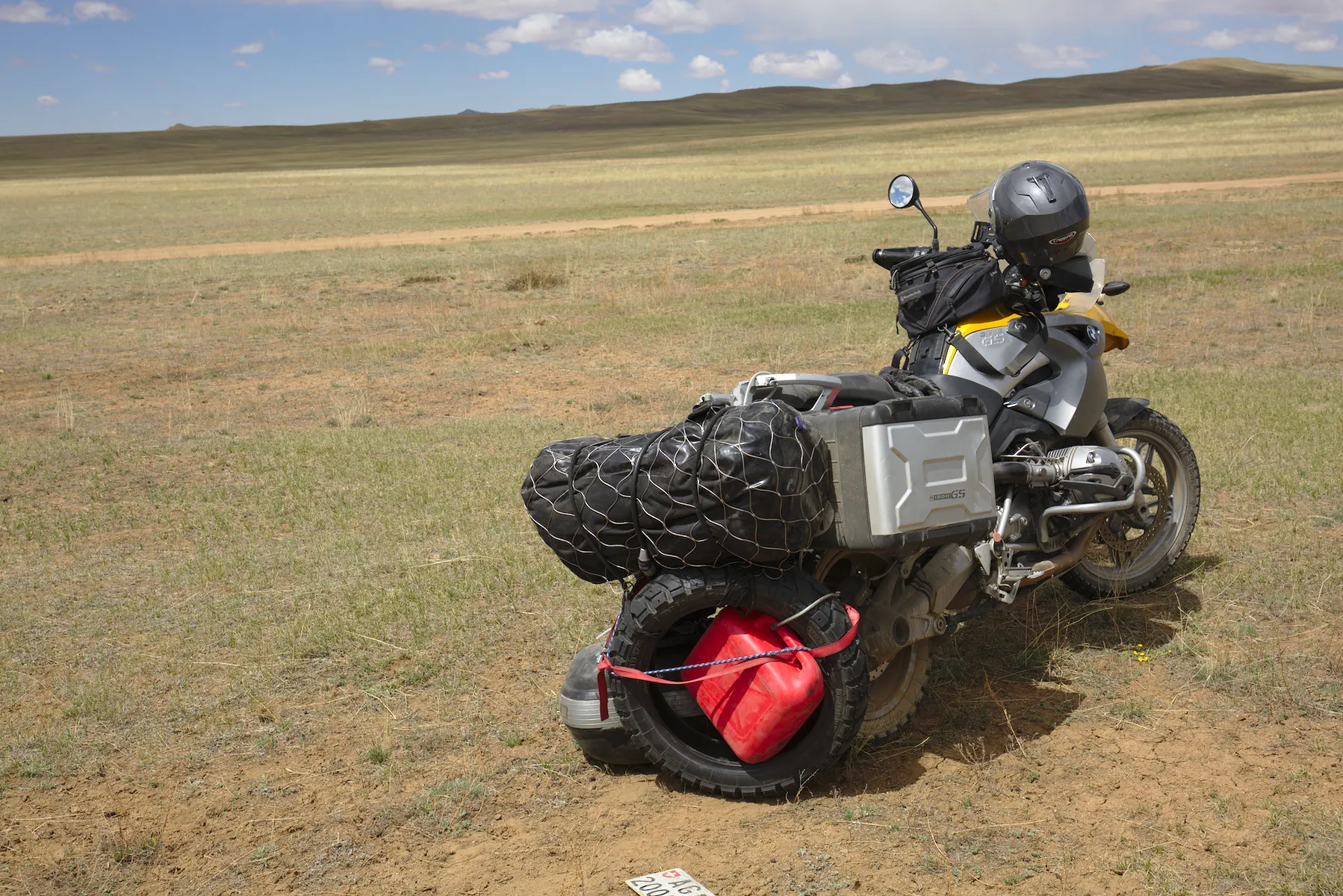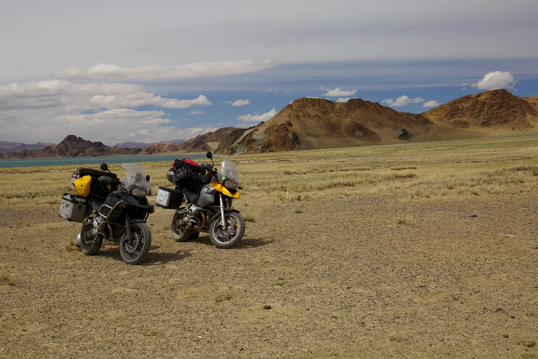 Vom Westen her führen drei grosse Routen nach Ulan Bator. Wir haben uns angesichts unseres engen Zeitplans und der Jahreszeit für eine Mischung zwischen südlicher und mittlerer Route entschieden, wo sich Teerstrassen mit Kies-, Sand- und Feldwegen abwechseln. Oft kann man nur erahnen, wo der Weg durchführt und man wählt selber eine Route durchs Gelände. Hin und wieder gibt es Gräben zu überwinden und Bäche zu durchqueren. Offroad-Spass und Anstrengung zugleich. In diesem anspruchsvollen Gelände hat sich gezeigt, weshalb BMW die 1200-er GS auch in einer stabileren Adventure-Ausführung herausgibt: während Janoschs Adventure die Herausforderungen fast problemlos meistert, kommt Günters GS an ihre Grenzen (neben der defekten Vorderradfelge sind jetzt auch das Topcase, der Gepäckträger und der linke Seitenkoffer weg). Genauso abwechslungsreich wie das Gelände sind auch unsere Übernachtungsmöglichkeiten: wunderschöne Zeltplätze, Jurtencamps und sagen wir mal ‘eher bescheidene’ Hotels.