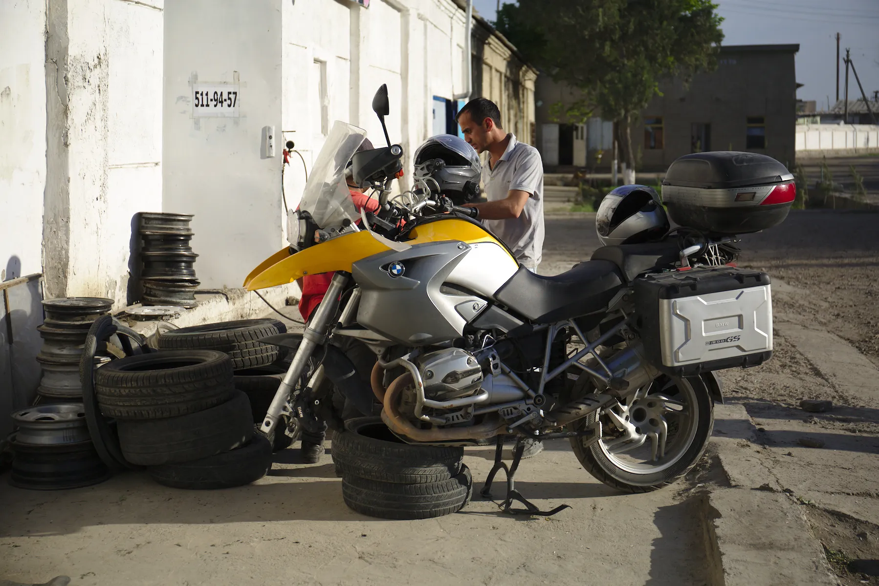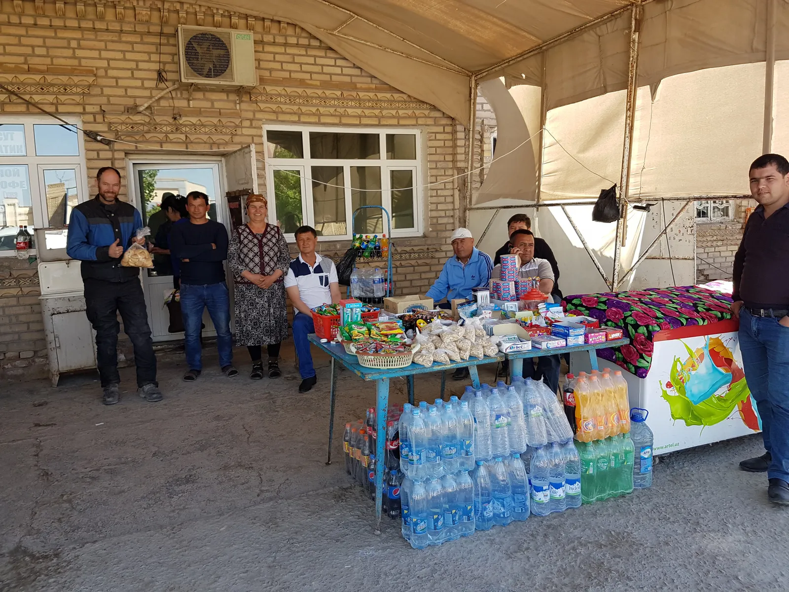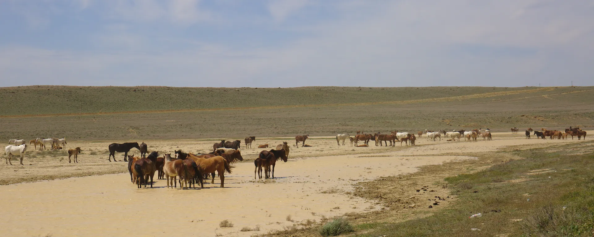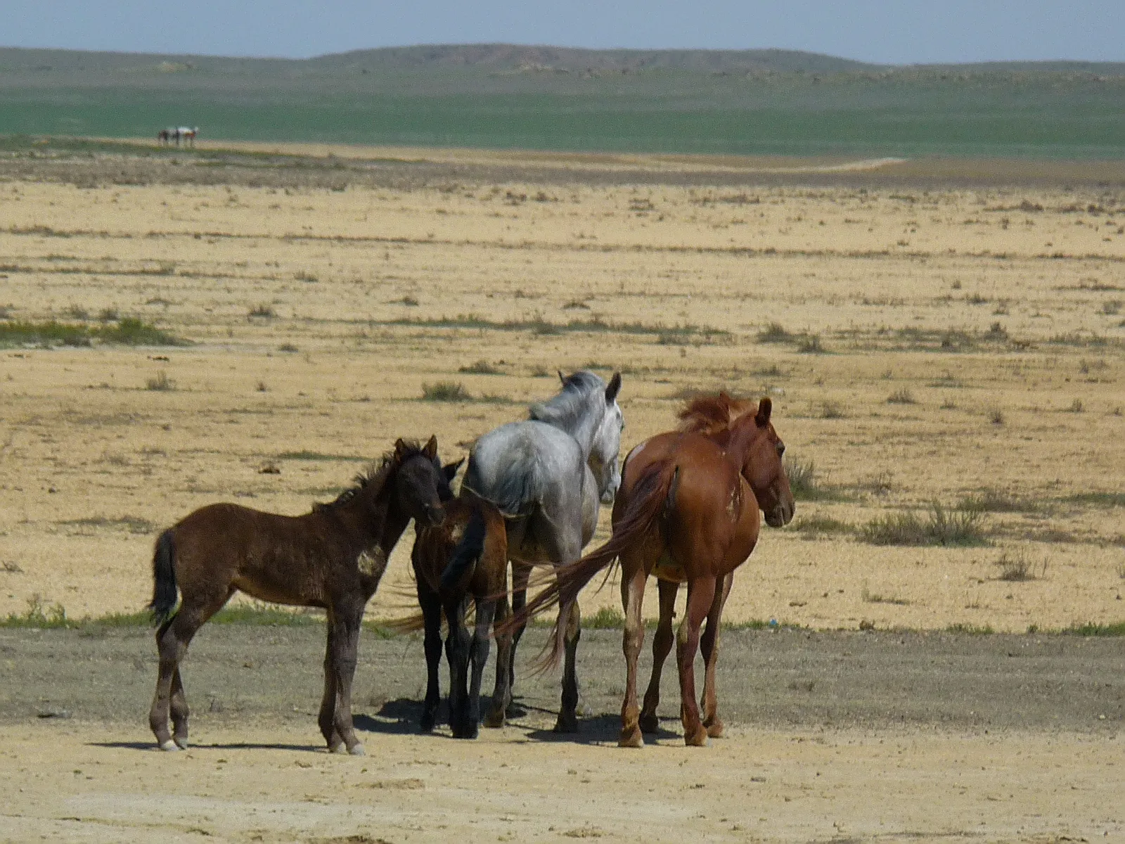 Nach dem Ausschlafen fahren wir Richtung Usbekistan, durch weite Steppenlandschaften mit unzähligen Kamelen und Pferden. Die Kamele erinnern daran, dass hier eine der Hauptachsen der Seidenstrasse durchführt. Hier haben Karawanen während Jahrhunderten Seide und andere Güter von China nach Europa transportiert. Die Strassen sind allerdings alles andere als seiden, über weite Strecken katastrophal und nur mit grosser Konzentration und Anstrengung befahrbar.